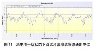 日常測試管道斷電電位時(shí),可以斷開(kāi)陰極保護電流,但無(wú)法斷開(kāi)地電流產(chǎn)生的電壓降V t,這會(huì )產(chǎn)生很大的電位測試誤差(圖 10),因此采用垂直管道放置2個(gè)試片的方法測試管道通斷電位曲線(xiàn)(圖 11)。