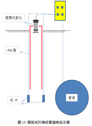 由于大地中存在的地電位梯度無(wú)法消除,傳統的管道通電電位、斷電電位測試已經(jīng)無(wú)法準確評估管道真實(shí)的陰極保護狀況。為了消除地電流影響,可以埋設參比管以及雙試片或環(huán)形試片來(lái)準確測試管道陰極保護狀況,如圖 13所示。