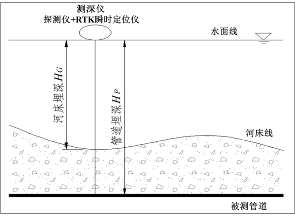 電磁測深技術(shù)采用的設備包括探管儀、測深儀及RTK瞬時(shí)定位儀。通過(guò)探管儀發(fā)射機對被測管線(xiàn)施加信號,在被測管線(xiàn)周?chē)a(chǎn)生二級磁場(chǎng),然后通過(guò)接收機在地面接收管線(xiàn)的二次磁場(chǎng),從而準確地確定管線(xiàn)的位置、埋深、走向、路徑。如圖 1所示,先利用探管儀在水面上確定管道的中心位置,探測管道埋深H P;在確定位置的同時(shí)采用RTK瞬時(shí)定位儀對管道進(jìn)行瞬時(shí)定位,并用測深儀(測深儀與RTK瞬時(shí)定位儀連接在一起)測出此點(diǎn)的瞬時(shí)水深HG,然后按照式1計算管道中心距河床的深度即管道埋深H 。在測試的過(guò)程中,沿管道軸線(xiàn)按每2 m采一個(gè)測點(diǎn),如果遇到埋深波動(dòng)超過(guò)15 cm的地段應加密進(jìn)行探測。
