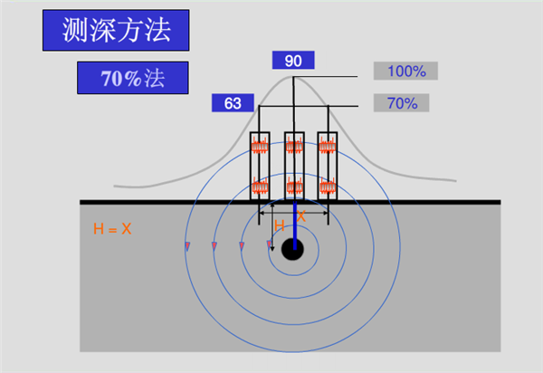 測試前將探管儀發(fā)射機與被測管道的陰極保護測試樁相連接,形成一個(gè)回路。在正式測試前應先對儀器進(jìn)行調試,目的是選擇最佳頻率,使測試結果準確。測試頻率的選定采用70%法進(jìn)行:在理想狀態(tài)下,接收機在管道中心正上方時(shí)電磁信號響應最大,并且電磁信號強度向觀(guān)測點(diǎn)沿管道走向垂直方向兩側逐漸衰減,左右出現最大響應值的70%時(shí),此時(shí)兩點(diǎn)間直線(xiàn)距離等于觀(guān)測點(diǎn)的管道中心埋深,如圖 2所示。