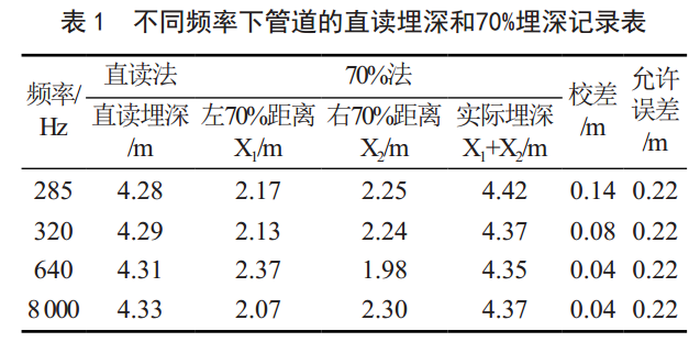 首先在被測管道合適的位置施加不同頻率的信號,在各頻率下記錄該點(diǎn)的直讀埋深,并通過(guò)70%法求得管道的真實(shí)埋深,然后計算不同測試頻率下直讀埋深與70%法測得的埋深誤差,取誤差最小的頻率作為最佳頻率。測試結果如表 1所示。