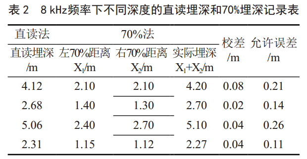 以上只是對一個(gè)固定埋深(4.38 m)進(jìn)行對比,結果誤差較小,為了驗證不同深度下均可用直讀數據代替70%法測得的實(shí)際埋深,又選取了幾個(gè)不同埋深的管段進(jìn)行了實(shí)驗,實(shí)驗結果如表 2所示。