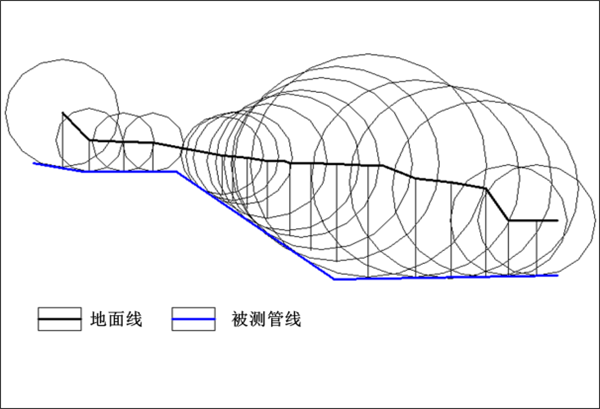 值得注意的是,在管道傾斜處,用探管儀測得的埋深是指測試點(diǎn)與傾斜管道之間的垂直距離,若將其直接作為管道的豎直埋深來(lái)確定管道位置則會(huì )使得測試結果出現誤差較實(shí)際埋深偏淺。為此,提出了作圓取公切線(xiàn)法。圖 4、5、6顯示了管道傾斜處直讀法和作圓取公切線(xiàn)法兩種方法獲得的管道埋深及其對比結果?梢钥闯鲎鲌A取公切線(xiàn)的方法獲得的管道埋深更為精確。本文采用作圓取公切線(xiàn)的方法來(lái)確定管道的真實(shí)埋深,在剖面圖中,每個(gè)測試點(diǎn)作為圓心,以測試埋深(不論管道是否傾斜)作為半徑作圓,然后各圓底部的公切線(xiàn)的連線(xiàn)即為管道的真實(shí)位置,如圖 5所示。