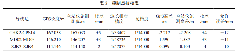 收集的該穿越段管道資料(CHK2、 CHK1、CPS14、 CPS13、 CTHCY2、 CTHCY1),經(jīng)過(guò)現場(chǎng)踏勘,只有CHK2、 CPS14還完好,其余均已破壞。通過(guò)現場(chǎng)校核平面控制達到一級導線(xiàn)精度,高程控制達到四等光電測距三角高程精度?梢允褂,校核情況見(jiàn)表 3。