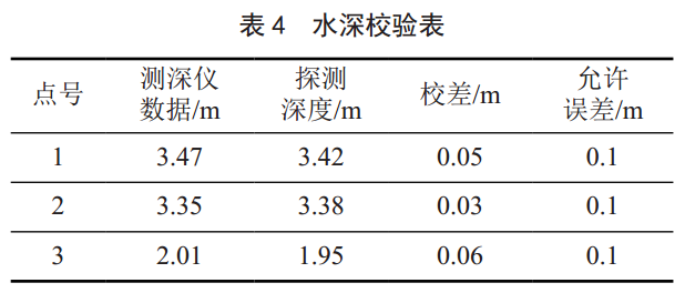 測深儀與RTK瞬時(shí)定位儀連接好后,應對測試水深作校驗。校驗方法如下,先用儀器測量水深,再在同一位置用標桿測量,二者比較,小于0.1 m時(shí)候測深儀誤差在合理范圍內。測試點(diǎn)選擇了3個(gè)水深校驗點(diǎn),校差為0.03~0.06 m,詳見(jiàn)水深校驗表 4。