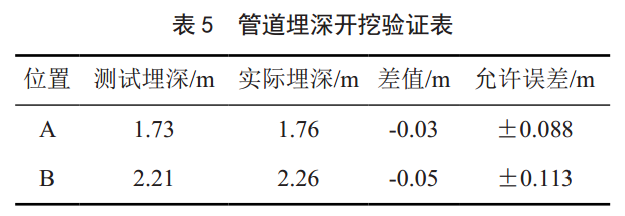 在被測管道陸地部分選擇一處測試點(diǎn)進(jìn)行測試,并采用直接開(kāi)挖的方法對管道埋深進(jìn)行驗證。其目的是獲取儀器測試值與實(shí)際埋深值之間的差異,掌握儀器誤差,測試結果如表 5所示。
