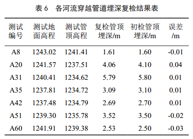從表 2可以看出,在8 kHz頻率下不同深度的直讀法與70%法計算所得管道埋深較為接近,相應的校差均小于允許誤差,滿(mǎn)足要求。經(jīng)以上分析,該穿越段管道埋深測試采用8 kHz頻率,用探管儀直讀的數據可以作為本次測試的管道實(shí)際埋深。