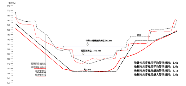 當數據采集完成之后,將每一個(gè)點(diǎn)對應的坐標、水面高程、水深、水底高程、管道埋深等數據進(jìn)行一一對應,并繪出穿越斷面的平面帶狀圖、河床斷面圖及管道埋深斷面圖。在斷面圖上,清楚反映已經(jīng)敷設管道的埋深,可供管理者使用。