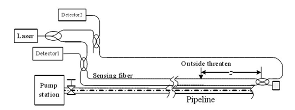 在第三方施工活動(dòng)頻繁的地段,利用光纖振動(dòng)傳感器能夠檢測到管道發(fā)生的極其微小的振動(dòng)信號,通過(guò)信號檢測定位,能夠及早發(fā)現并警示出發(fā)生的管道損壞行為(圖 3)。