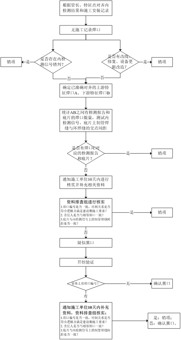 疑似黑口在正式開(kāi)挖驗證之前,需要查找檢測報告和底片,確認該焊口信息是否存在。①核實(shí)原始施工記錄、無(wú)損檢測申請(委托單)、無(wú)損檢測記錄(報告)、底片上的焊口編號是否一致,不同資料的時(shí)間關(guān)系是否合乎邏輯并滿(mǎn)足建設期施工要求。②核實(shí)疑似黑口與上下游焊口同種資料的責任人是否一致。③核實(shí)施工單位提交底片的交角間距與內檢測信號交角間距是否一致。如果都能滿(mǎn)足要求,需要對疑似黑口進(jìn)行銷(xiāo)項,不再進(jìn)行現場(chǎng)開(kāi)挖驗證。否則,需要進(jìn)行現場(chǎng)開(kāi)挖驗證,根據開(kāi)挖結果判斷焊口是否屬于黑口(圖 4)。