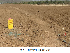 根據焊口清單、《環(huán)焊縫焊口定位作業(yè)管理規定》和焊口基礎信息,對需要開(kāi)挖復拍的焊口定位。定位過(guò)程中同時(shí)收集焊口周邊地形地貌、地質(zhì)條件等信息,并根據現場(chǎng)情況,評估開(kāi)挖難度,測算土方工程量及措施工程量,為后續開(kāi)挖作業(yè)提供指導,現場(chǎng)定位情況如圖 1所示,紅色標志為定位點(diǎn)。在批次焊口定位完成后,定位單位形成簽字蓋章版定位報告, 報告包含每道焊口的位置信息、埋深、周邊地貌及地質(zhì)條件、土質(zhì)類(lèi)型、工程量、措施量等信息,為項目預算和焊口開(kāi)挖提供前期基礎數據[2]。
