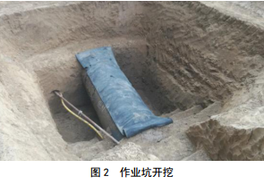 在定位報告的基礎上,開(kāi)挖承包商依據項目部編制的《環(huán)焊縫質(zhì)量風(fēng)險排查項目標準作業(yè)坑開(kāi)挖實(shí)施方案》(簡(jiǎn)稱(chēng)方案)開(kāi)挖作業(yè)。方案將陜京管道焊口開(kāi)挖作業(yè)坑分為普通段(一、二類(lèi)土)標準坑、山區段(三類(lèi)土)標準坑和淤泥段標準坑,并對不同標準坑的尺寸、形狀、放坡比例和支護措施進(jìn)行了規定。開(kāi)挖承包商在嚴格執行規定的同時(shí),結合現場(chǎng)地理環(huán)境等條件可適當調整方案,確保作業(yè)坑安全可靠,為后續作業(yè)提供保障,焊口作業(yè)坑開(kāi)挖如圖 2所示。