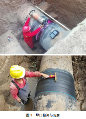 作業(yè)坑開(kāi)挖完成后,檢測和防腐單位進(jìn)場(chǎng)作業(yè)。為達到環(huán)焊縫質(zhì)量隱患排查標準化目的,項目部編制了《環(huán)焊縫焊口數據采集作業(yè)管理規定》《環(huán)焊縫焊口無(wú)損檢測作業(yè)管理規定》《環(huán)焊縫防腐補口作業(yè)管理規定》,分別規范原防腐層情況、焊口基本信息、焊口打磨、焊口檢測和防腐等作業(yè),依據各項管理規定所要求的操作標準,在作業(yè)現場(chǎng)記錄焊口排查的詳細內容和實(shí)施情況,各工序操作人員分別填寫(xiě)環(huán)焊縫補口調查數據采集表、環(huán)焊縫排查開(kāi)挖焊口信息采集表、環(huán)焊縫UT、 PT/MT缺陷記錄表和環(huán)焊縫防腐補口記錄表,并經(jīng)現場(chǎng)監理工程師審核簽字后歸檔待查,焊口檢測和防腐如圖 3所示。