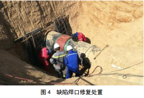 經(jīng)開(kāi)挖復拍后確認焊口質(zhì)量無(wú)缺陷符合管道運行要求時(shí),防腐后回填即可。經(jīng)射線(xiàn)檢測后存在裂紋、根部未融合等較嚴重缺陷的焊口,進(jìn)一步采取TOFD+PAUT檢測復檢,復檢結果仍為不合格時(shí)委托第三方進(jìn)行適用性評價(jià),依據適用性評價(jià)給出的建議措施修復處置焊口[3],加B型套筒修復缺陷焊口如圖 4所示。