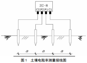 ①在測量點(diǎn)使用接地電阻測量?jì)x(常用儀器為ZC-8,誤差不大于3%),采用四極法進(jìn)行測試,測量接線(xiàn)見(jiàn)圖 1。