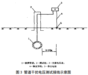 測量?jì)x表應具有防電磁干擾性能。參比電極可采用鋼棒電極、硫酸銅電極。采用鋼棒電極時(shí),其鋼棒直徑不宜小于16 mm,插入土壤深度宜為100 mm。參比電極應豎直布置,與埋地金屬管道之間的距離應大于10 m。每次測試時(shí),參比電極位置宜保持一致。參比電極設置處,地下不應有冰層、混凝土層、金屬及其他影響測試的物體。土壤干燥時(shí),應濕潤地面。按圖 3接好測試線(xiàn)路,然后直接記錄測試值。