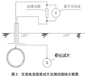 采用極化探頭或試片測試交流電流密度,利用標準電阻測量管道和試片間的連接電纜中的交流電流,除以測試試片的面積,即為交流電流密度(圖 5)。