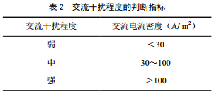 結合以上數據,通過(guò)計算或實(shí)測得到交流電流密度,判斷腐蝕風(fēng)險。管道受交流腐蝕風(fēng)險可按表 2確定。對于交流電流密度大于30 A/m 2的位置應重點(diǎn)關(guān)注。
