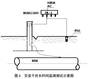 對于交流干擾電壓劇烈波動(dòng)或交流干擾嚴重管段,進(jìn)行24 h交流干擾電壓監測。按照圖 6的接線(xiàn)方式連接,記錄管道的24 h交流電壓。根據管道沿線(xiàn)土壤電阻率、交流電壓大小及波動(dòng)情況,評價(jià)交流干擾的嚴重程度。