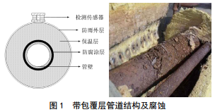為了防腐和保溫,管道本體大都包裹在防腐層或保溫層等之下,這給常規檢測帶來(lái)了較大的困難(見(jiàn)圖 1)。檢測傳感器距離管道本體的距離稱(chēng)為提離高度,受距離影響在高提離高度下的電磁響應信號極其微弱、背景噪聲大。