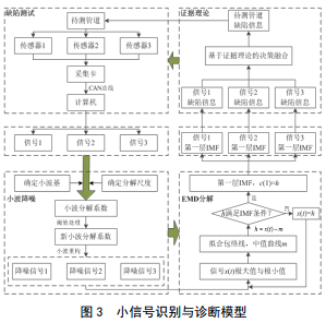 本文提出了一種基于脈沖磁渦流原理的油氣管道缺陷外檢測技術(shù),研制了相應的軟硬件系統。同時(shí),為了解決在高提離度下,信號小、背景噪聲大的難點(diǎn),提出了基于sym8小波的信號降噪方法,降噪后利用EMD分解的第一層本征模態(tài)函數(IMF)提取小信號特征。針對微弱信號準確捕捉和定位的難題,利用多傳感器信息融合技術(shù),建立了小信號識別與診斷模型,并開(kāi)展了多源信號特征提取研究,如圖 2所示。試驗結果表明,該模型可有效提取管道缺陷小信號的特征。