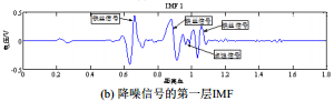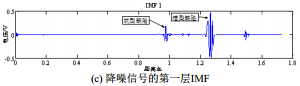 傳感器位于被測表面正上方約16 mm處,沿管的軸向的推進(jìn)速度約為1 m/s。利用本文提出的方法對脈沖磁渦流信號進(jìn)行處理,結果如圖 7所示:圖 7(a)為原始信號,圖 7(b)為基于sym8小波降噪后的信號,圖 7(c)為降噪信號的第一層IMF。