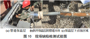 傳感器距離管道本體表面約為50 mm,測試速度為1 m/s,測試信號如圖 9所示。圖 9中存在三處疑似缺陷信號,如圖中標注。然后進(jìn)行多次測試,信號基本保持穩定。為驗證信號準確性,對包覆層進(jìn)行剝離,如圖 10所示。剝離最外層白鐵皮,發(fā)現白鐵皮下存在固定保溫棉的細鐵絲,鐵絲間距約20 cm,與測試中的疑似缺陷信號對應。進(jìn)一步剝離保溫層,管 道外表面存在輕微點(diǎn)蝕。