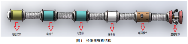 管道內腐蝕檢測器包括裝置定位器、萬(wàn)向節、定位電池組、探頭電池組、電磁發(fā)射與渦流檢測裝置、速度控制板、電路控制和數據存儲裝置、裝置位置接收器、里程計數輪和驅動(dòng)皮碗幾個(gè)功能組件,整機結構如圖 1所示。