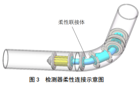 優(yōu)選采用不銹鋼彈簧連接方式,確保檢測器實(shí)現柔性連接,能夠自由順暢的通過(guò)1.5 D的彎頭,保證整機強度,以應對高壓水流推動(dòng)。見(jiàn)圖 3。