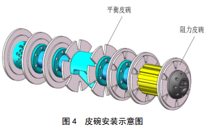 阻力皮碗既要保證有一定的強度和密封性,又要防止阻力太大造成推動(dòng)不均勻、不順暢,影響檢測器在管道中的勻速行進(jìn)。經(jīng)過(guò)大量試驗反復修改皮碗幾何尺寸等參數,最終優(yōu)化確定最合理的尺寸參數,確保檢測器在管道中的通過(guò)性。皮碗安裝示意見(jiàn)圖 4。