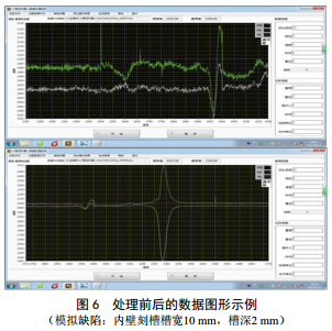 檢測器在工作中,存在干擾和本身的電磁干擾,實(shí)際檢測出來(lái)的數據存在大量的噪聲,這些噪聲如果不被剔除,就有可能將有用信號淹沒(méi)而無(wú)法顯示判斷 缺陷的波形,需要開(kāi)發(fā)專(zhuān)用的數據分析和處理軟件,數據圖形界面見(jiàn)圖 6。