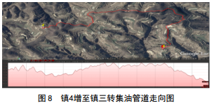 選擇采油十一廠(chǎng)鎮4增至鎮三轉集油管道800 m管段進(jìn)行檢測試驗,管道基本情況和高程見(jiàn)表 2和 圖 8。檢測結果在123.7 m處,壁厚信號振幅達486,疑似缺陷,見(jiàn)圖 9。