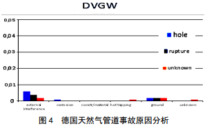 德國從1978年開(kāi)始建立了管道事故/事件報告制度和管道失效數據庫。據德國供氣供水技術(shù)協(xié)會(huì )(The German Technical and Scientific Association forGas and Water, DVGW)統計,從1981年至2011年近30年天然氣管道事故率降低了90%(圖 3),事故率僅為0.01起/千公里·每年,其中高壓輸送管道的事故率僅為輸配管道的2.2‰,管道安全管理水平非常高。這主要得益于兩個(gè)方面:一是DVGW制定了更高的質(zhì)量、安全標準并有效實(shí)施;二是城市輸配管網(wǎng)中大量使用聚乙烯管道(PE管)代替原來(lái)的鑄鐵 管。事故原因排序見(jiàn)圖 4 [3-5]。