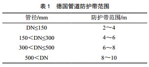 主要經(jīng)驗有:(1)預防原則,采用嚴格的監管保證管道安全。(2)通過(guò)立法明確保護目標、要求和各方責任。(3)在管道建設和運營(yíng)過(guò)程采用被廣泛認可的技術(shù)法規和標準。主要安全技術(shù)措施有:(1)提高安全系數,增加壁厚,加大安全裕量,其天然氣管道設計系數最高僅為0.625。(2)安裝緊急切斷閥。(3)要求焊縫100%檢測。(4)必須進(jìn)行壓力試驗。(5)人口密集區加密設置地面標識和警示標準。(6)增加管道埋深,最小埋深不小于1米。(7)采用防腐層+陰極保護的腐蝕防護措施,并加強焊縫防腐補口質(zhì)量檢測,開(kāi)展陰保效果監測。(8)縮短地面和空中巡檢的頻率。(9)采用先進(jìn)的管道內檢測技術(shù)進(jìn)行檢測。(10)開(kāi)展泄漏檢測。(11)開(kāi)展應力測試。(12)加強全過(guò)程質(zhì)量監督等[3,5]。德國相關(guān)法規并未對管道“最小安全距離”作出規定,但是要求設置管道防護帶,具體規定見(jiàn)表 1。特殊情況下,采用相應措施后,可以調整防護帶的范圍。管道保護帶內不允許有建筑物、不允許施工、不允許開(kāi)展有損管道和影響管道運行一切活動(dòng)。