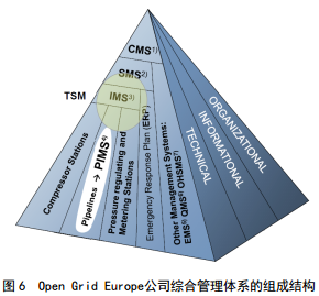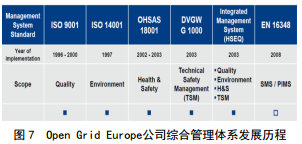 Open Grid Europe是德國最大的天然氣管道公司,運營(yíng)管理的管道超過(guò)1.2萬(wàn)公里。該公司從1996年開(kāi)始先后建立了質(zhì)量、環(huán)境和安全管理體系, 2003年按照DVGW G1000的要求,建立綜合管理體系,2008年又結合EN 16348要求,將線(xiàn)路和站場(chǎng)全部納入完整性管理體系(IMS),統籌完整性管理體系(IMS)和應急相應計劃(ERP)構建了企業(yè)安全管理體系(SMS)。 Open Grid Europe的綜合管理體系模塊結構如圖 6所示,綜合管理體系發(fā)展歷程見(jiàn)圖 7[7]。