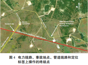 在電力線(xiàn)路規劃階段,受委托的SAM(測繪)公司為了識別沿輸電線(xiàn)路周邊所有的地下公用設施,于2009年11月3日,向Texas 811(德克薩斯州挖掘安全系統公司)提出了一個(gè)定位申請,以便測量區域范圍和標記地下管線(xiàn)的位置。接到申請后, Texas 811分別給Enterprise公司和ET公司發(fā)送天然氣管道定位標簽。隨后ET公司管道定位人員定位并標記了地下管道,同時(shí)告知Texas 811定位工作已經(jīng)完成。 Texas811立即聯(lián)系SAM公司通知ET公司的管道已被標記(圖 4)。但是,相距很近的 Enterprise公司的管道仍然沒(méi)有被標記。