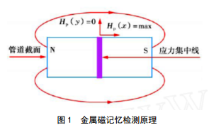 當鐵磁性構件受到外部載荷作用時(shí),受地球磁場(chǎng)激勵,在應力和變形集中區域會(huì )發(fā)生具有磁致伸縮性質(zhì)的磁疇組織定向和不可逆的重新取向,磁疇組織的重新取向會(huì )導致構件內部產(chǎn)生新的磁狀態(tài)。金屬構件表面的這種磁狀態(tài)記憶了微觀(guān)缺陷或應力集中的位 置,即所謂的磁記憶效應(圖 1)。