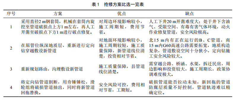 根據管道破損點(diǎn)周邊環(huán)境,初步確定四套搶修方案(表 1)。