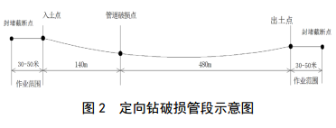 全部搶修施工在定向鉆入土點(diǎn)和出土點(diǎn)位置進(jìn)行(圖 2),關(guān)鍵施工技術(shù)是對破損管段兩端帶壓封堵、清管拉拔以及新管線(xiàn)回拖安裝等。