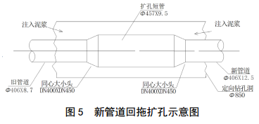 Φ 457×9.5 mm短管(圖 5)連著(zhù)舊管道一起回拖,同時(shí)給新管道引成了擴孔回拖空間。