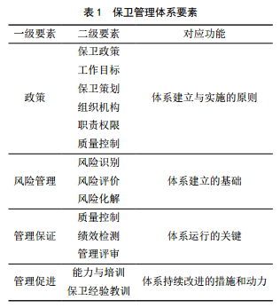 (1)保衛工作體系要素。以PDCA循環(huán)為基礎,各要素環(huán)環(huán)相扣,缺一不可,形成完整管理鏈條。體系最終以文件化的形式呈現(表 1)。