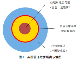 油氣管道發(fā)生泄漏失效后可能產(chǎn)生火災熱輻射、有毒氣云、拋射碎片、噪音及沖擊波超壓等后果影響。管道危害距離的制定應考慮管道失效后最嚴重的情況,管道運營(yíng)企業(yè)到達現場(chǎng)后可依據現場(chǎng)情況及專(zhuān)家建議進(jìn)行動(dòng)態(tài)調整。英國管道危害距離主要包括三類(lèi)即熱輻射傷害范圍(應急計劃距離)、應急危害距離(初始警戒線(xiàn))和應急指揮區(外圍警戒線(xiàn))。三者之間的關(guān)系如圖 1所示。