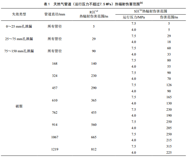 熱輻射傷害范圍是管道失效后個(gè)體遭受熱輻射傷害的最遠距離,氣體管道應考慮管道破裂的情況,液體管道考慮管道發(fā)生孔泄漏后的液體噴射距離,對于未列入重大事故隱患管道的液體管道當地應急救援部門(mén)也應采用該危害范圍作為應急計劃距離。
