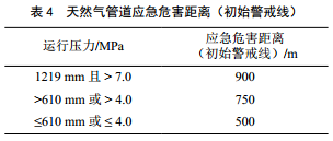 天然氣管道發(fā)生泄漏失效后,依據是否點(diǎn)燃及何時(shí)點(diǎn)燃會(huì )導致一系列不同的事故后果。立即點(diǎn)燃形成的熱輻射傷害是最嚴重的傷害后果。如果未被點(diǎn)燃,應采取必要的措施確保在可燃濃度范圍內沒(méi)有點(diǎn)火源?扇細庠频姆秶c泄漏的壓力、泄漏的方向、大氣條件等有關(guān),往往難以預測。推薦的應急危害距離(初始警戒線(xiàn))如表 4所示。