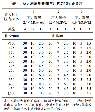 SNAM公司管道完整性管理中沒(méi)有高后果區的概念,在通過(guò)建構筑物和特定場(chǎng)所等人員密集場(chǎng)所時(shí)根據《非超高密度天然氣輸送的設計、施工、運行和監測技術(shù)規則A0,8》的規定設置一定的安全距離,其設置原則與管徑和壓力有關(guān)。在管道建設期通過(guò)土地所有人的土地時(shí)采用簽訂合同的方式明確管道路由的主權,一般簽訂周期為30年。管道與建構筑物的法定間距如表 1所示。