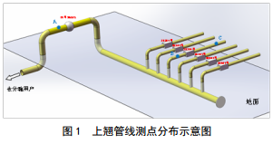 測點(diǎn)分布:根據上翹管線(xiàn)的初步受力分析,選擇3個(gè)危險點(diǎn)(A、 B、 C)作為測點(diǎn),如圖 1所示。