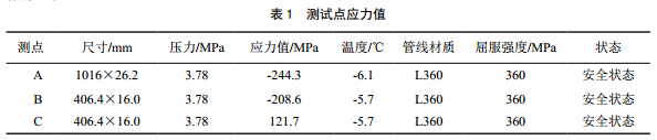 管線(xiàn)材質(zhì)為L(cháng)360鋼,屈服強度為360 MPa。研究表明壓應力引發(fā)疲勞裂紋或斷裂,其門(mén)檻值比拉應力高3~4倍[4]。所以測點(diǎn)A、 B、 C均處在安全狀態(tài)。