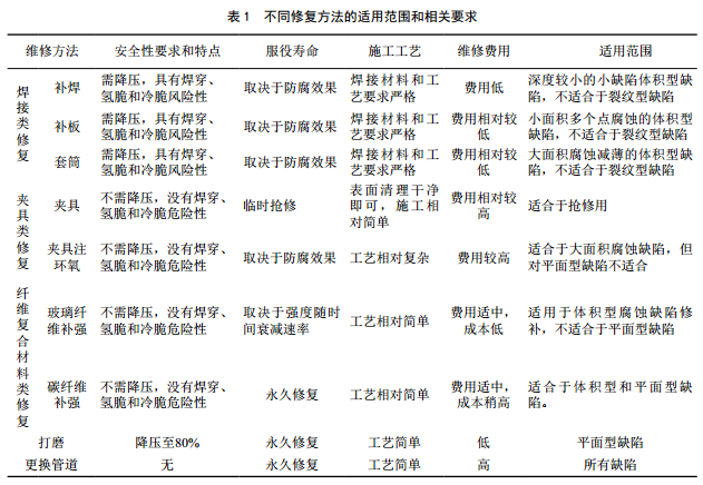 管道本體修復技術(shù)主要遵循 QSY 1592―2013《油氣管道管體修復技術(shù)規范》。修復方法的適用范圍和要求詳見(jiàn)表 1。