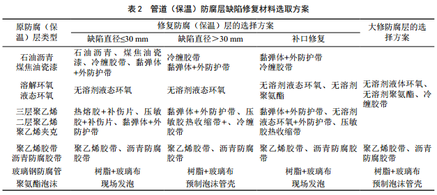 管道外防腐保溫層修復主要遵循的標準是 SY/T 5918―2011《埋地鋼質(zhì)管道外防腐層修復技術(shù)規范》和 GB/T 50538―2010《埋地鋼質(zhì)管道防腐保溫層技術(shù)標準》。不同(保溫)防腐層缺陷修復材料選取方案詳見(jiàn)表 2。