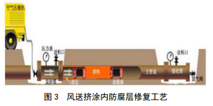 目前,常用的管道內修復技術(shù)遵循 SY/T 4076―2016《鋼質(zhì)管道液體涂料風(fēng)送擠涂?jì)韧繉蛹夹g(shù)規范》和 SY/T 4110―2007《采用聚乙烯內襯修復管道施工技術(shù)規范》,主要包括三種修復工藝(圖 3、 4、 5)。